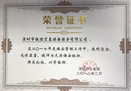 祝賀我司在2017年度保安管理工作中,表現(xiàn)突出,成績顯著,被深圳市公安局評為先進(jìn)保安組織。