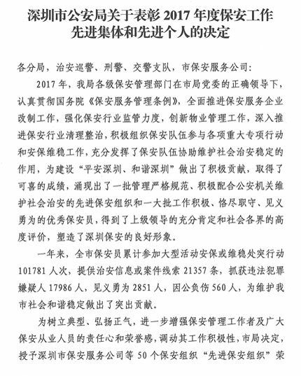 深圳市公安局關于表彰2017年度保安工作