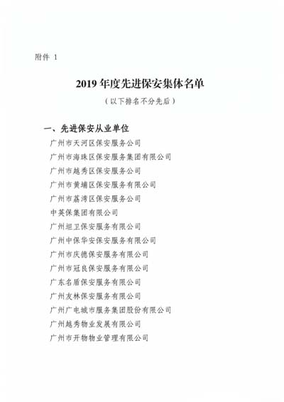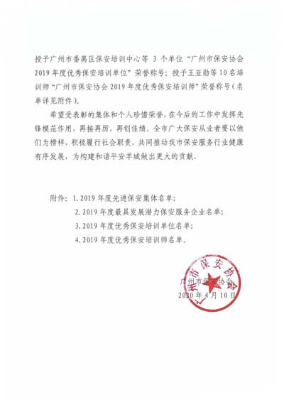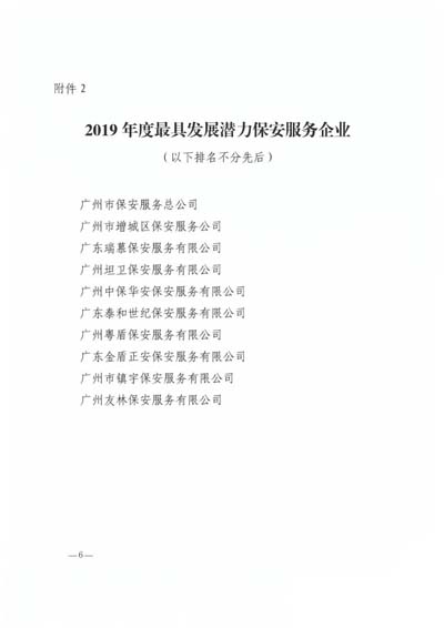 廣州市保安協會2019年度先進保安集體”榮譽稱號;授予廣州市保安服務總公司等10個單位“廣州市保安協會2019年度最具發(fā)展?jié)摿Ρ0卜掌髽I(yè)”榮譽稱號;授予廣州市番禺區(qū)保安培訓中心等3個單位“廣 州市保安協會2019年度優(yōu)秀保安培訓單位”榮譽稱號;授予王亞勛等10名培訓師“廣州市保安協會2019年度優(yōu)秀保安培訓師”榮譽稱號(名單詳見下文)。
