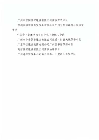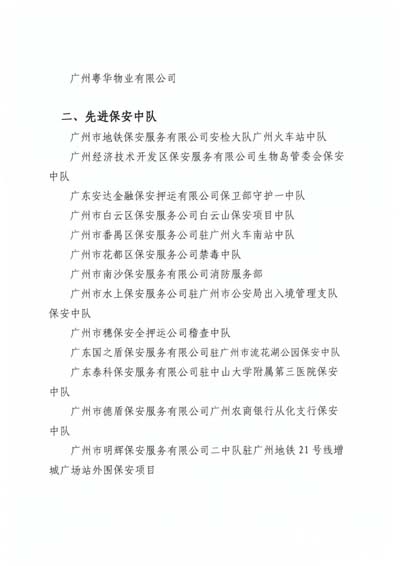 為掀起行業(yè)學先進、趕先進、爭先進的良好氛圍,推動我市保安服務行業(yè)健康發(fā)展,經過自評、初評、專家復核、會長辦公會審議后公示等評選程序,協會決定授予廣州市天河區(qū)保安服務公司等36個單位(含中隊)“